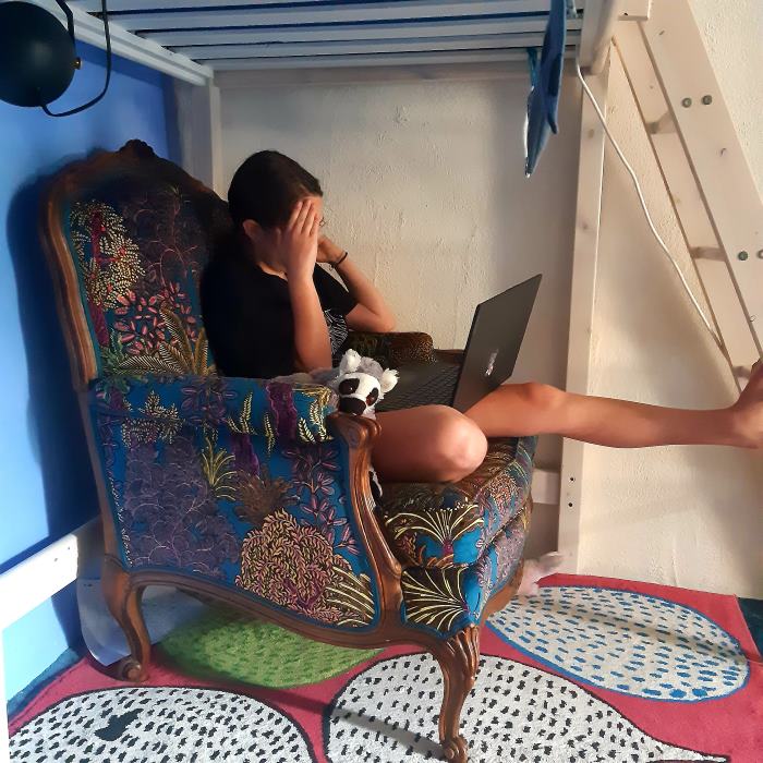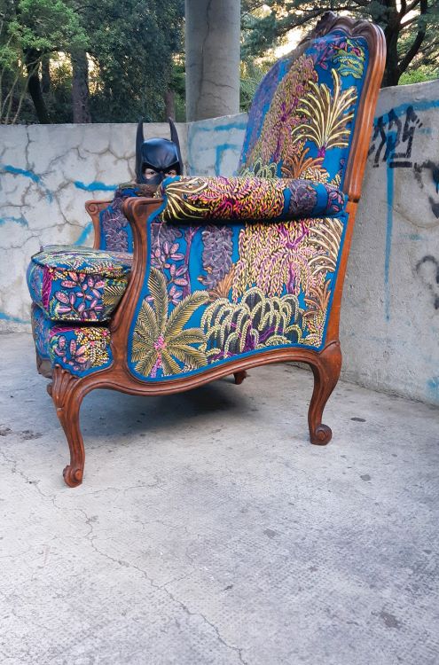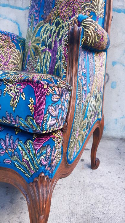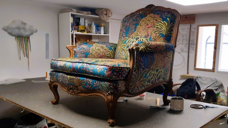 La couverture est réalisée avec le velours majorelle de Thévenon (3.5m)