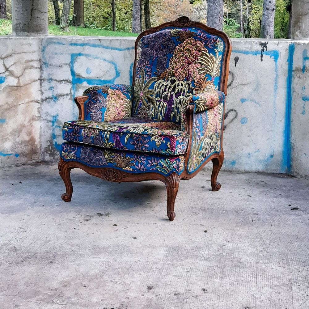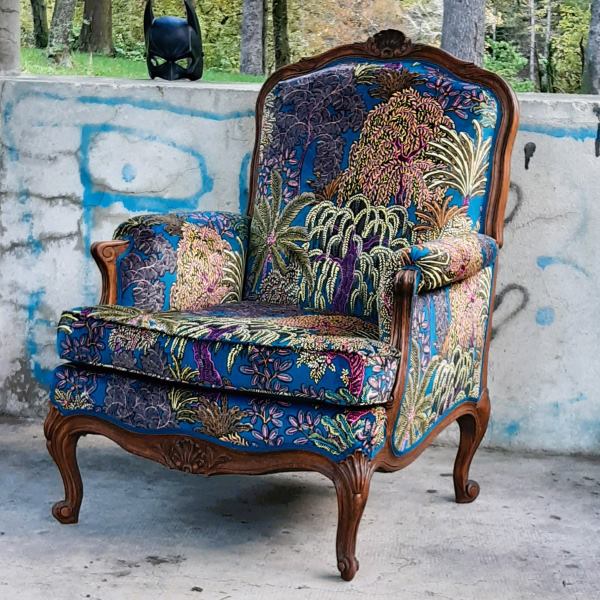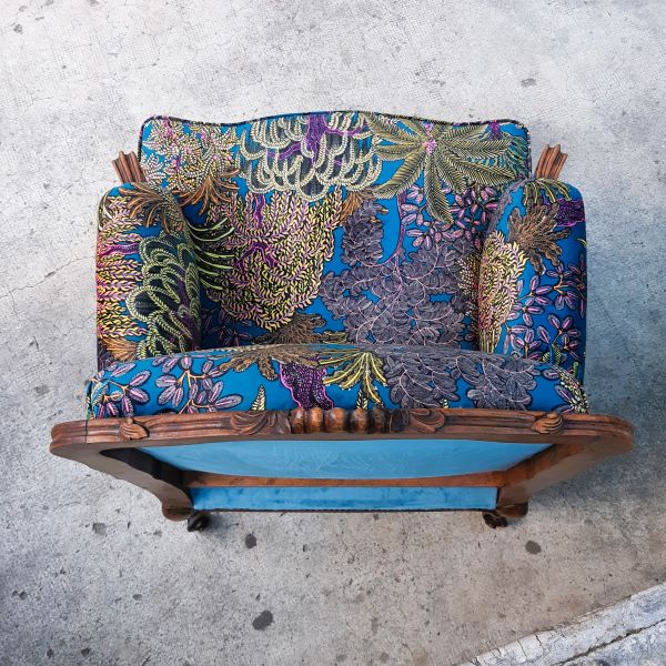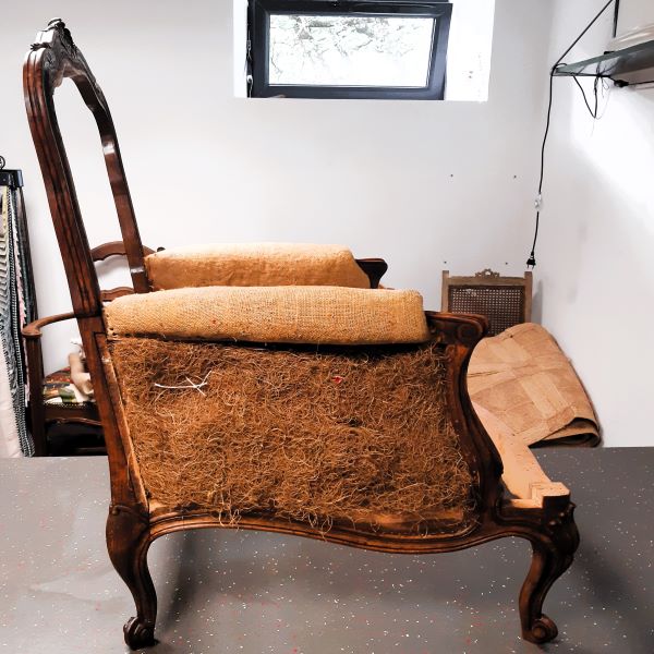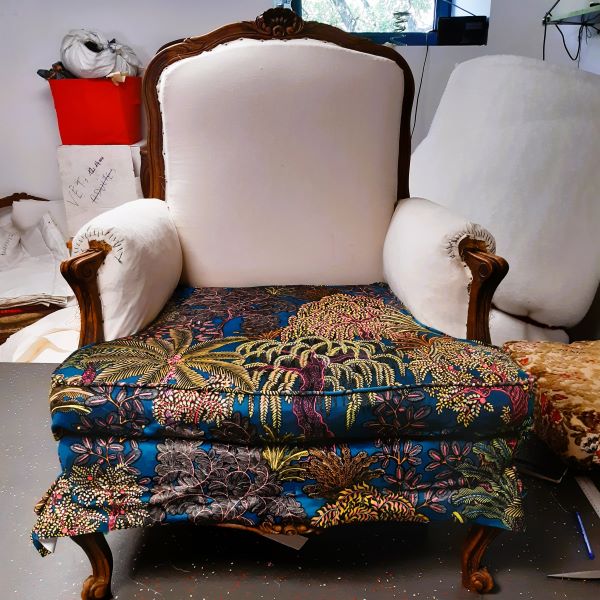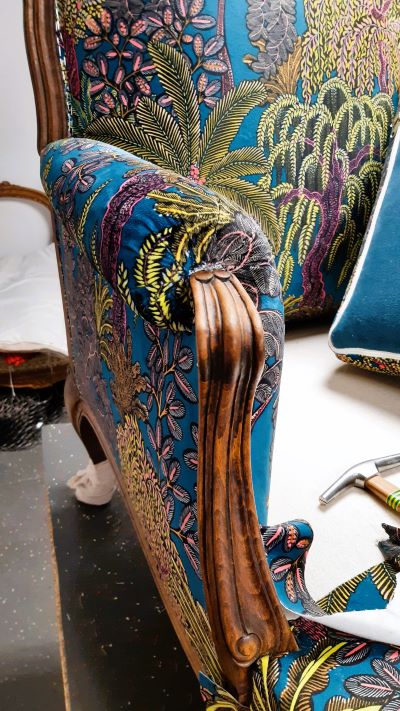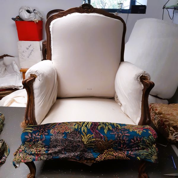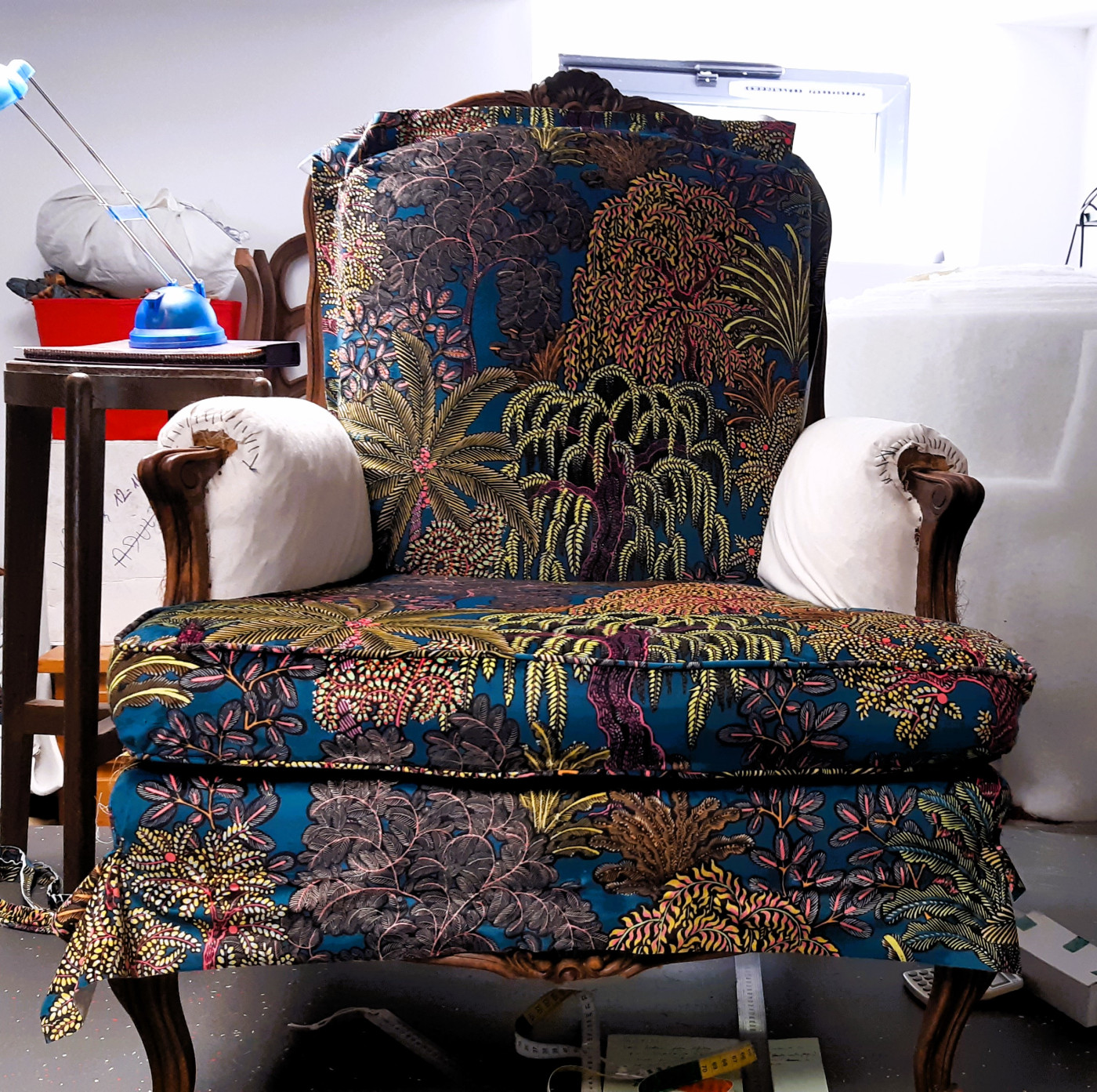 Réfection partielle : la garniture des accotoirs et du dossier, en bon état, sont conservés mais regonflés pour retrouver confort et volume. La garniture de l'assise à cuvette avec ressorts, et le coussin sont entièrement refaits
