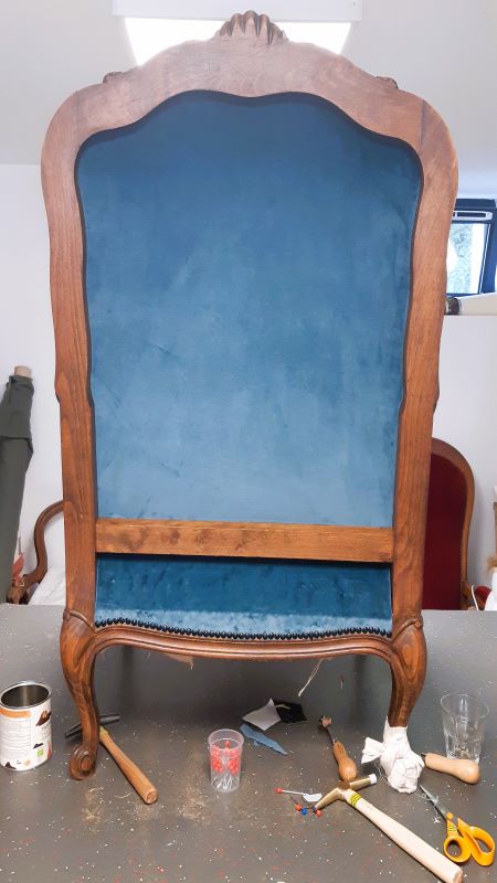 et un velours gris bleu en stock à l'atelier, sur le dossier extérieur (1,2m)