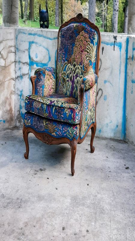 Fauteuil bergère de style régence, inconfortable (dos creusé et coussin d'assise déformé) et au tissu élimé. La confection initiale est mixte : crin + mousse.