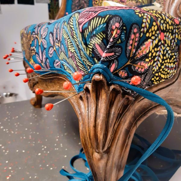 La finition double corde est coordonnée avec le fond bleu du tissu (7m)