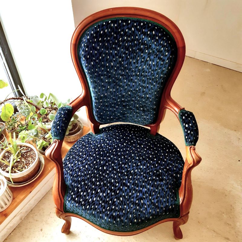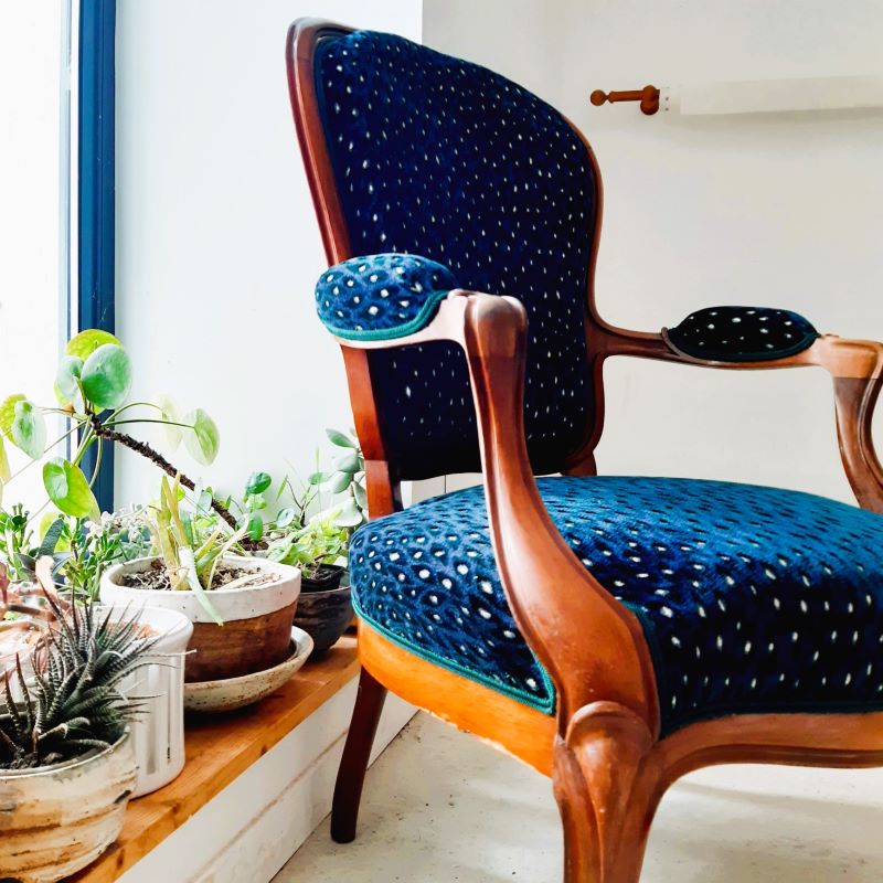 La couverture est réalisée avec le velours Paon de chez Nobilis