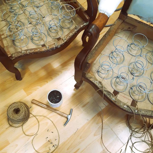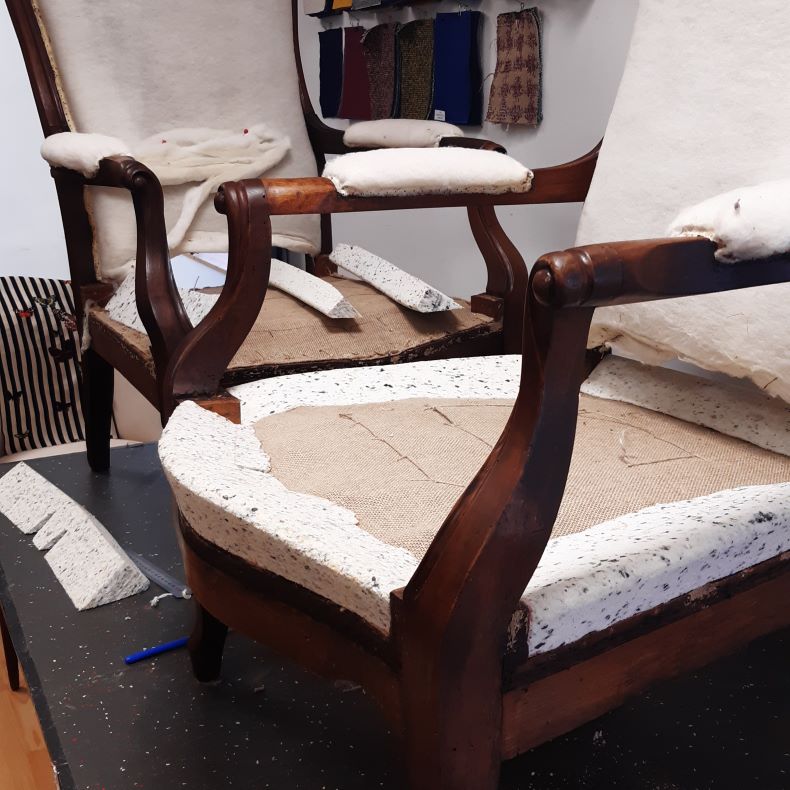Pour cette restauration de fauteuils Voltaire, plusieurs matériaux ont été nécessaires afin de retrouver une assise confortable et durable :