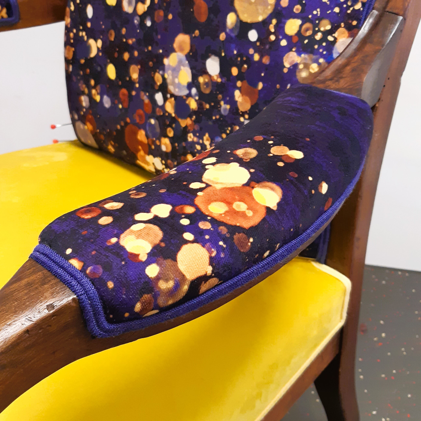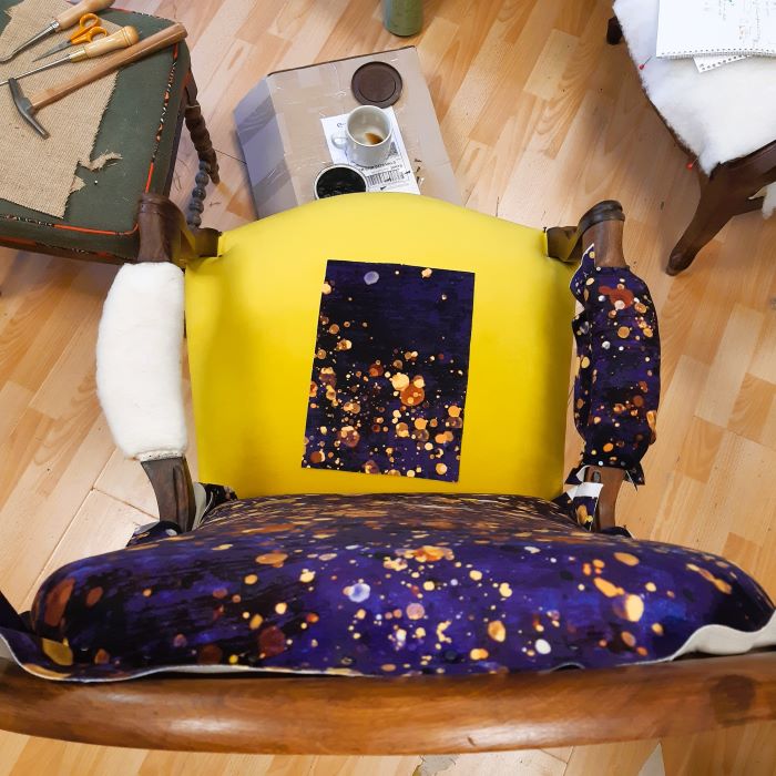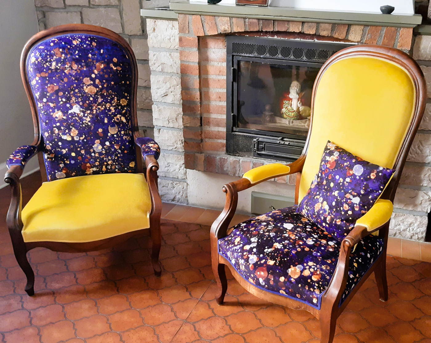 La cliente souhaitait profiter de cette réfection pour redonner du confort à ses fauteuils, mais aussi leur apporter une touche plus gaie et lumineuse. L’idée retenue a été de jouer sur une alternance de tissus : un jaune uni associé à un tissu à motifs bleu et jaune pour chercher du peps, et de la lumière!