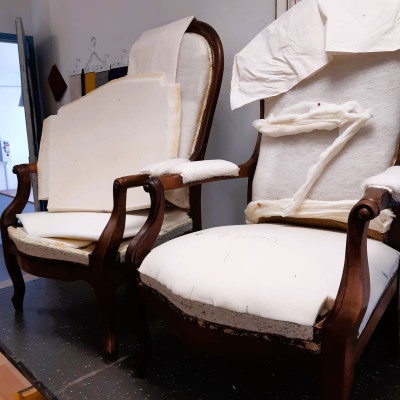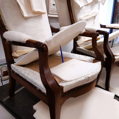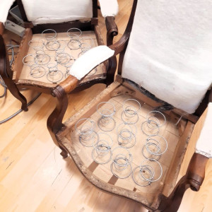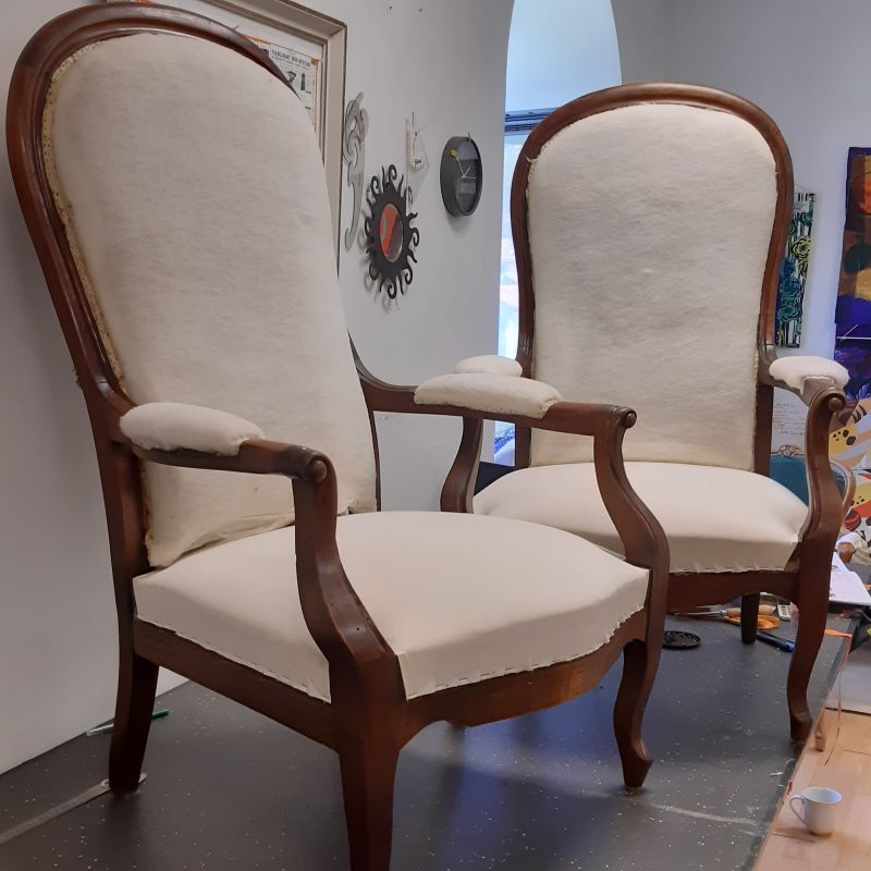 La réfection complète de l’assise de ces deux fauteuils Voltaire a demandé environ 20 heures de travail pour la paire.