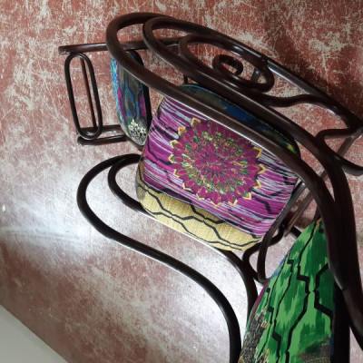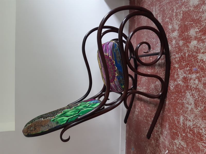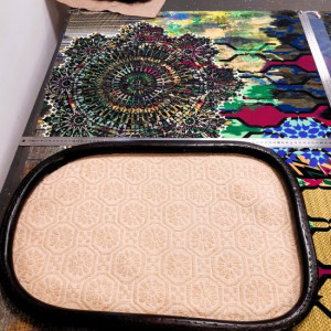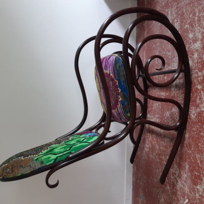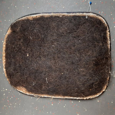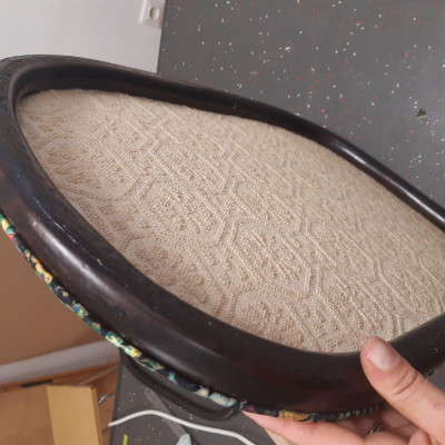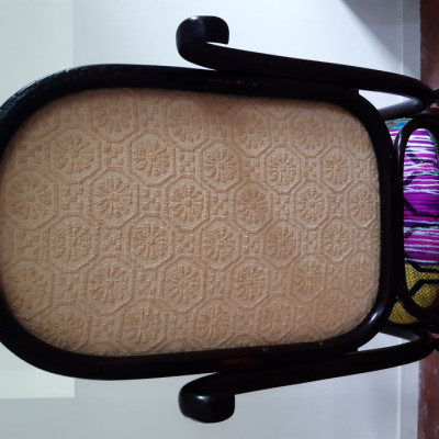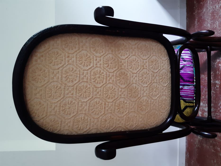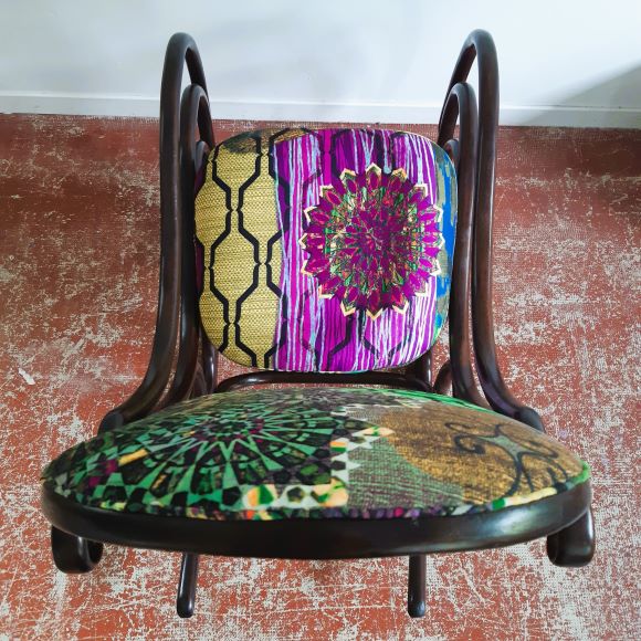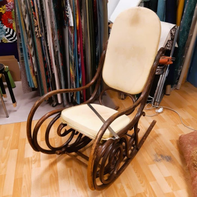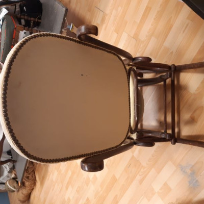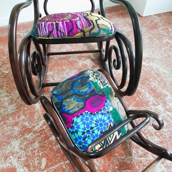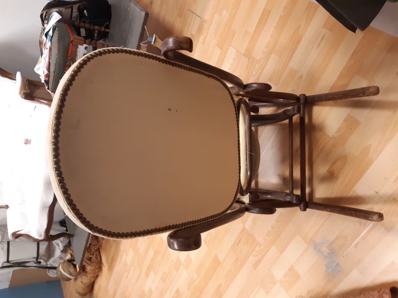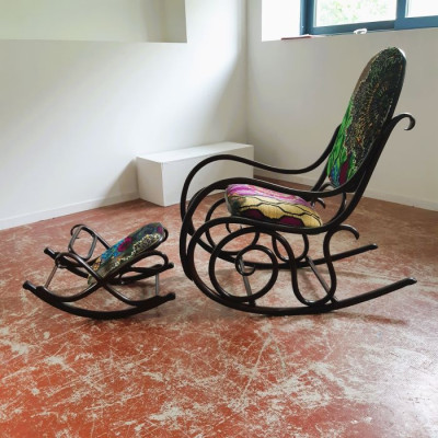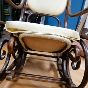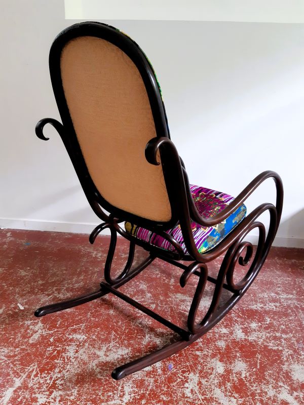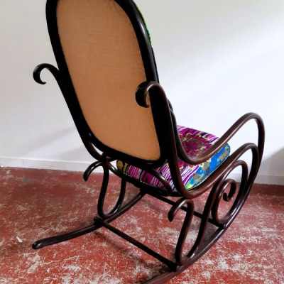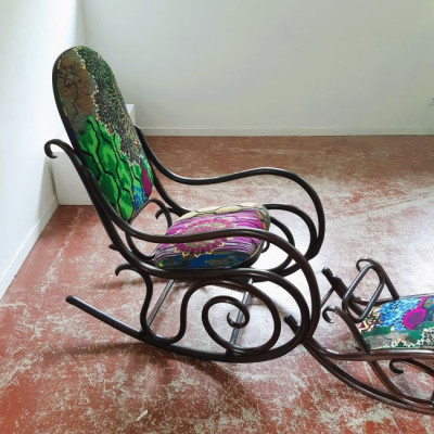 Lorsque Carole m'a apporté le rocking-chair de ses grands parents, c'était dans l'idée de le refaire, et si possible de retrouver le repose pieds qui avait été intégré au fauteuil pour le stabiliser. C'est donc un travail a 4 mains et quelques aller-retours entre l'atelier de menuiserie (pour le stabiliser et redonner du lustre au bois) et de tapisserie ! J'ai refait la garniture d'assise en mousse, et la couverture.