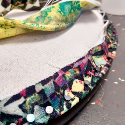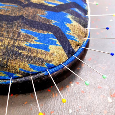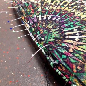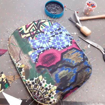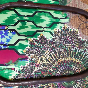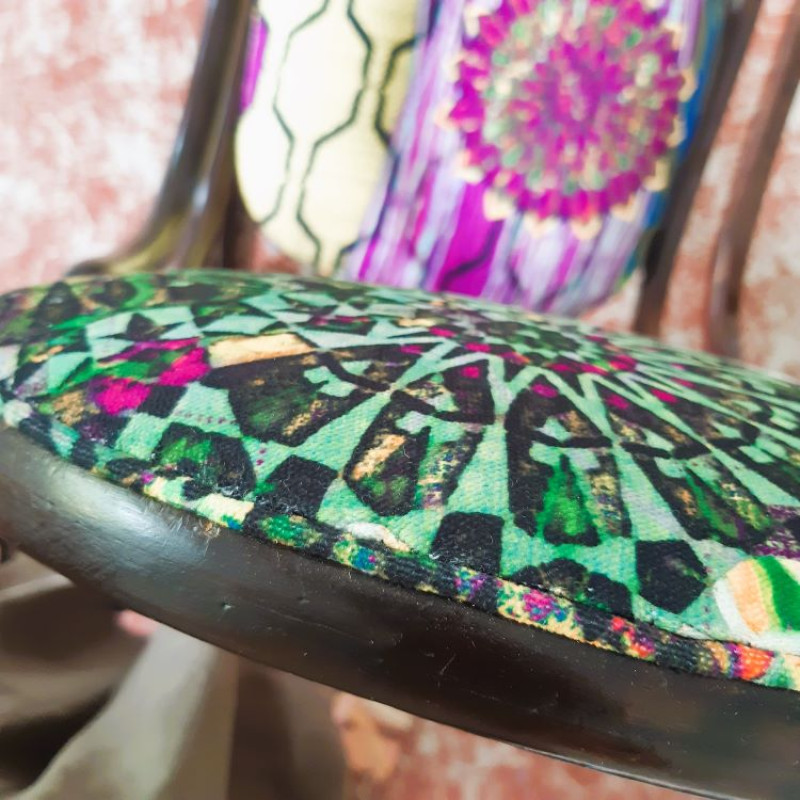 Le tissu choisi est le woodstock de chez casal. Pour l'arrière du dossier, nous avons décidé en cours de route de reposer l'ancien tissu, souvenir des grands parents, qui était resté en bon état sous le schintz jaune (LA bonne surprise!). En plus, le motif allait bien avec la rosace du woodstock!